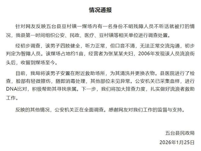 1月25日晚,山西五台县民政局发布情况通报称,针对网友反映五台县豆村镇一煤场内有一名身份不明残障人员不听话就被打的情况,该县第一时间组织公安、民政、医疗、豆村镇等相关单位进行调查处置。