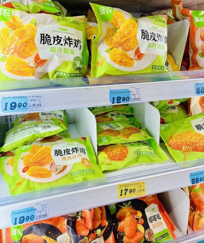 类似的情况也出现在大润发超市,界面新闻在北京丰台一家大润发门店冷柜陈列区域看到,安井旗下冻品先生的糖醋里脊、圣农品牌的嘟嘟翅等快手菜产品陈列丰富,而大润发自有品牌的“润发工坊”产品在这个区域仅有麻辣罗氏虾、醉虾等4个单品在售。