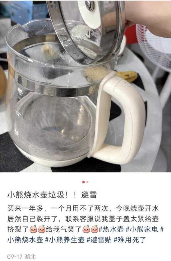 还有消费者吐槽小熊的电热水壶,“买来一年多,一个月用不了两次,今晚烧壶开水居然自己裂开了,联系客服说我盖子盖太近给壶挤裂了,给我气笑了。”