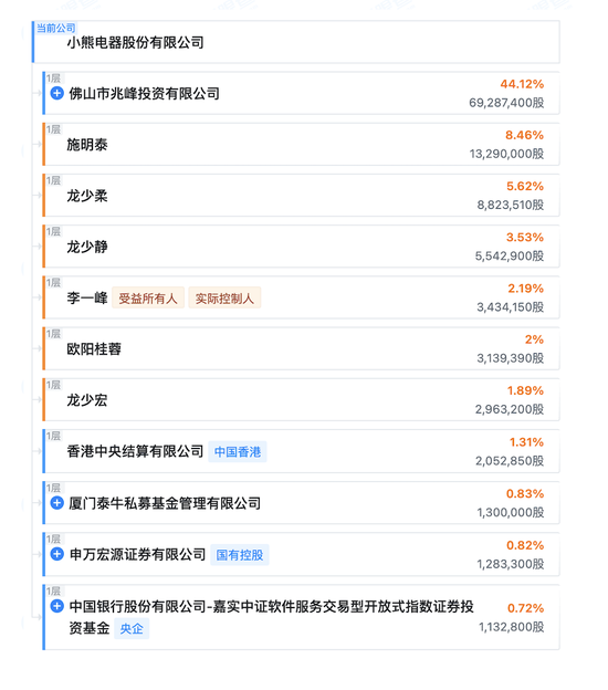 500)this.width=500 align=center hspace=10 vspace=10 alt=从股权结构来看,现任小熊电器股份有限公司董事长、总经理李一峰与张红夫妇通过佛山市兆峰投资有限公司持有小熊电器44.12%的股份,该公司由二人全资控股。此外,李一峰还直接持有该公司2.19%的股份。