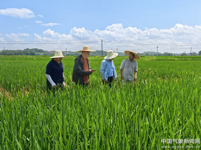 2025年6月6日,江西省泰和县气象工作人员开展早播示范点水稻长势调查。 江西省气象局供图