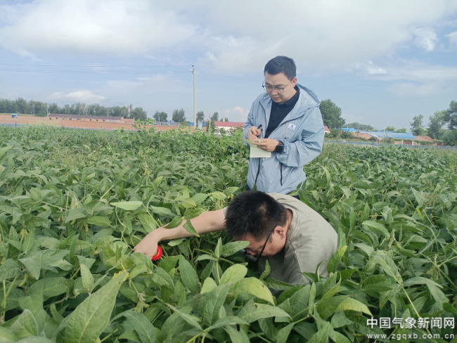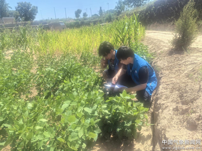 2025年7月,陕西省清涧县气象局服务人员深入折家坪镇白家峁村大 豆种植区,调查强降水对大豆生长的影响。 榆林市气象局供图