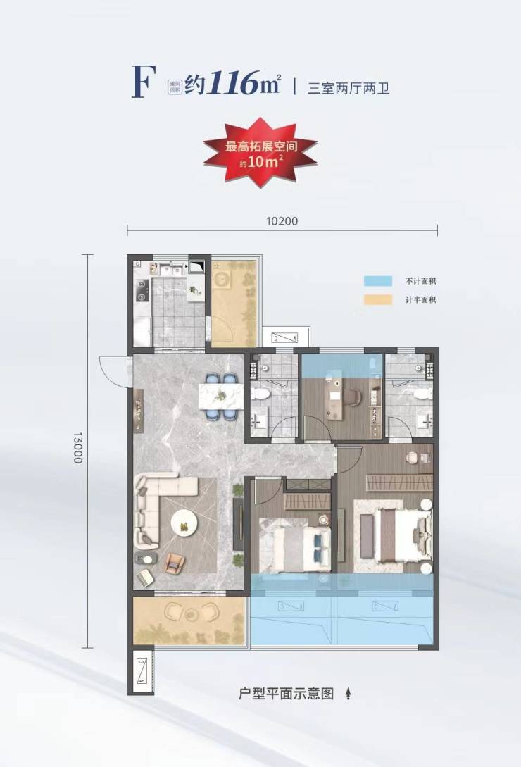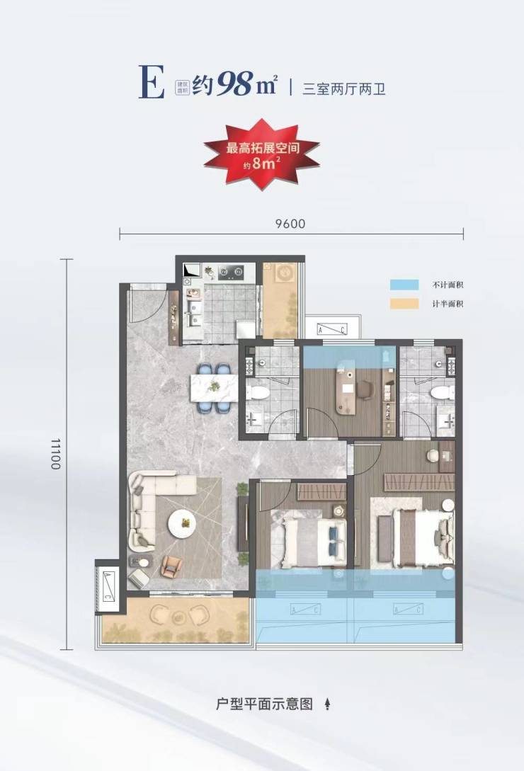 双卧朝南,沐浴清晨暖阳,傍晚霞光。南向三阳台设计,阳光肆意,室外美景全览于室。朗阔客厅,餐客厅一体化动线,为生活洒满幸福。厨房连接生活阳台,美食与美景亦可兼得